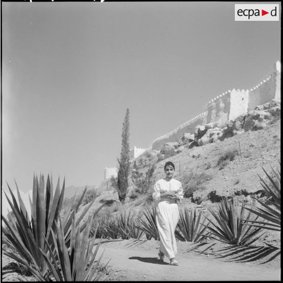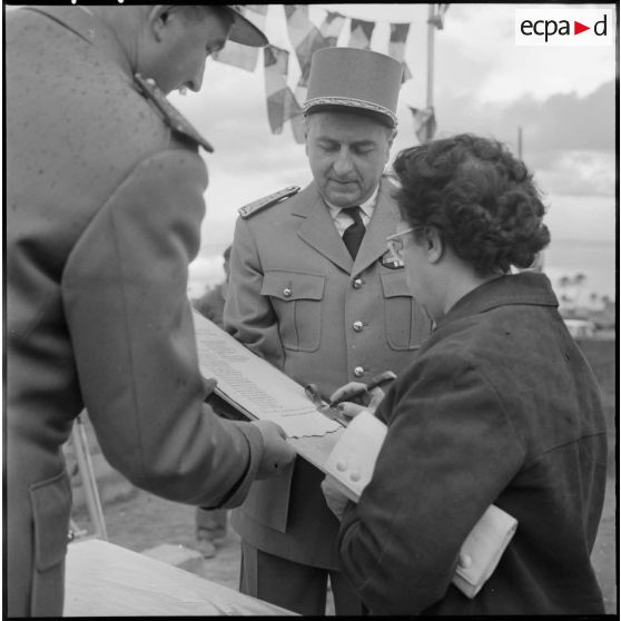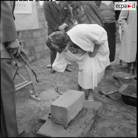 Pose de la première pierre du foyer féminin de Colomb-Bechar. Une femme signe le parchemin, tenu par le préfet J.P. Roy.