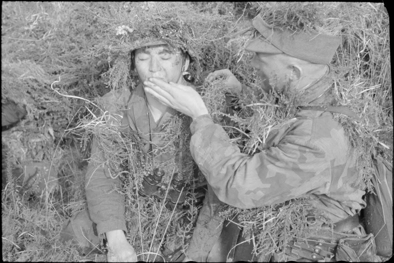 Le général (Generalleutnant) Richard Schimpf guide le général (General der Flieger) Kurt Student lors de la visite d'un terrain de manœuvre du 3.Fallschirmjäger.Division. Student assiste à une démonstration de camouflage. A l'aide de la végétation et de terre, deux hommes se dissimulent dans des buissons. Un masque vient recouvrir leur visage pour un camouflage plus complet.
