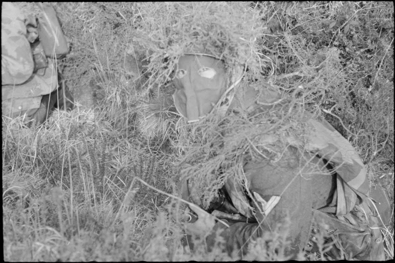 Dans les monts d'Arrée, un parachutiste allemand de la 3.Fallschirmjäger.Division recouvert d'un camouflage.