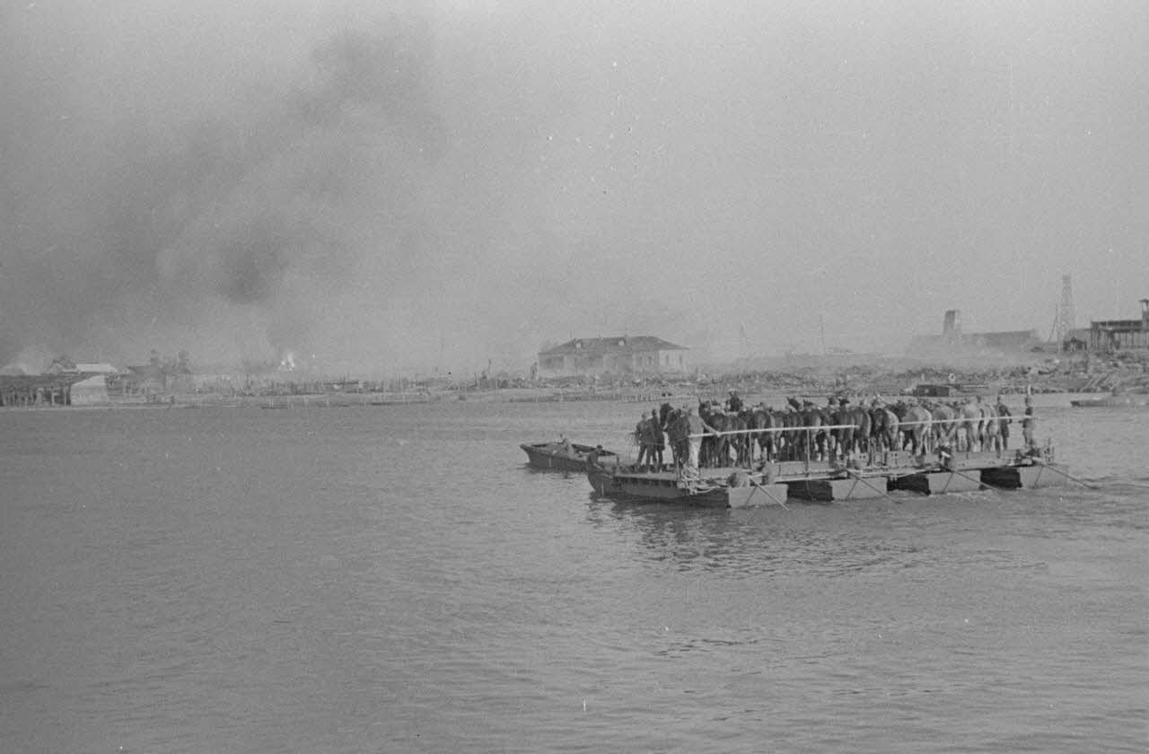Des soldats et des chevaux traversent le cours d’eau à bord d’une barge.