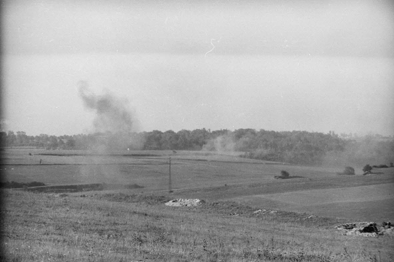 Le blindé B1 bis "Crécy-au-Mont" est parvenu jusqu'au cœur des positions allemandes du Mont-Caubert. Détruit à proximité d'un canon de 8,8 cm FlaK, il suscite l'intérêt du reporter et de l'équipe de tournage qui se rapproche du char.