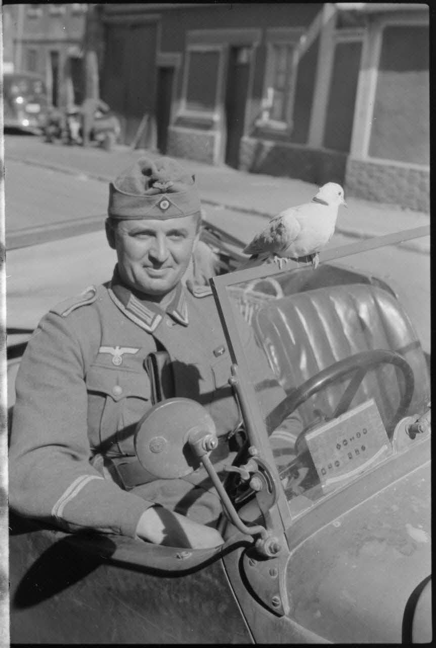 Un adjudant de compagnie, surnommé Spiess, en présence d'un pigeon.