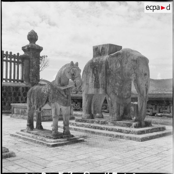 Statues d'un cheval et d'un éléphant sur la deuxième terrasse du tombeau de l'empereur Khai Dinh.