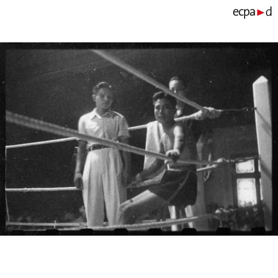 Boxeurs au coin du ring lors d'un gala de boxe à Saigon.