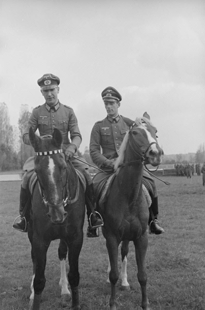 Le reporter immortalise deux cavaliers connus pour leurs succès remportés lors des jeux olympiques de l'été 1936. On reconnaît le lieutenant Heinz Pollay, médaille d'or de dressage avec à l'époque sa monture "Kronos" (cliché L12). Le commandant Rudolf "Rolf" Lippert connu également lors des jeux avec, en 1936, sa monture "Fasan". Lippert était également le responsable de l'école d'équitation d'Hanovre (Reiterschule Hannover). A partir du 20 juin 1940 au 08 décembre 1940, le Major Lippert est commandant du 9e bataillon de reconnaissance (Aufklärung-Abteilung).