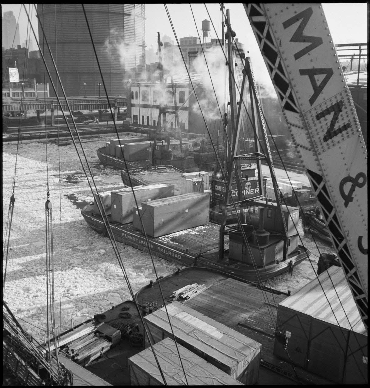 Dans le port de New-York pris par les glaces, des chalands transportent des caisses contenant des avions destinés aux Alliés, qui vont être chargées sur des cargos.