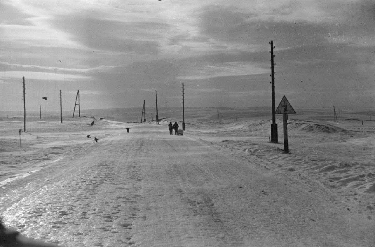 Le reportage présente deux aspects du front, les activités d'un terrain d'aviation d'une part et une tempête de neige sur une route glacée d'autre part.