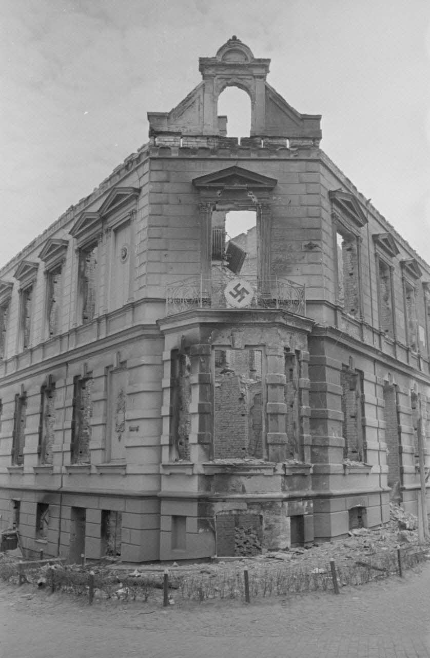 Bâtiment en ruine avec symbole nazi.
