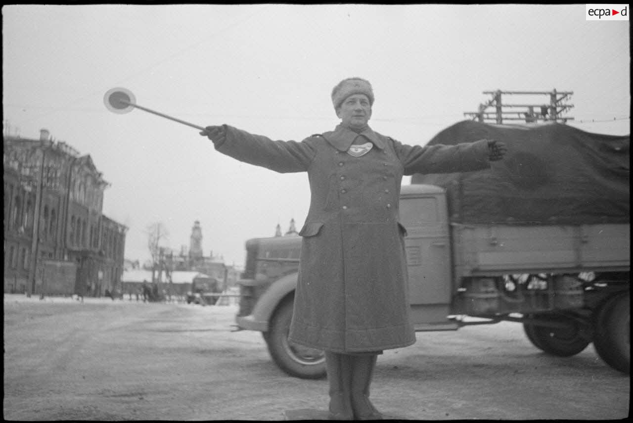 Sur une place de Vitebsk (Witebsk), la circulation est assurée par Feldgendarme, on reconnaît sa plaque hausse-col. Des femmes issues de la minorité allemande, ou qui travaillent pour l'occupant, sourient au photographe qui les immortalise. A la gare de Vitebsk (Witebsk), des permissionnaires de retour de leur foyer vont rejoindre leur garnison. Les soldats déposent leur paquetage sur un traineau pour en faciliter le transport. Les traineaux sont tractés par des enfants qui échangent leur service contre du pain ou des cigarettes.
