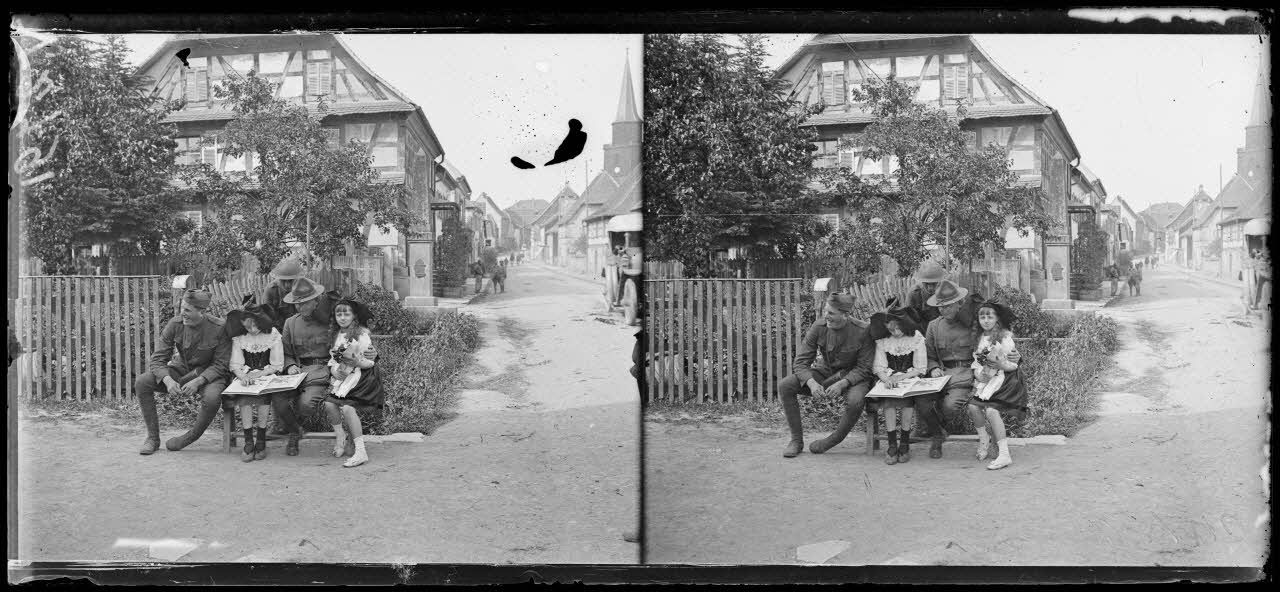 - Dans le village de Grandvillars (Territoire de Belfort, 30/05/1918, V 2790 à V 2814), les soldats du 370e RIUS (régiment d'infanterie américain) sont stationnés dans la ville. Cette unité de l'armée américaine appartient à la 93rd Infantry Division (93e division d'infanterie américaine) surnommée "Les casques bleus" (en raison du casque Adrian) et composée exclusivement de soldats afro-américains et portoricains. Une revue de la garde est effectuée, puis la fanfare du régiment joue sur la place. Le chef de corps, le colonel Franklin A. Denison, est présent. Le soldats font des mouvements de gymnastique, courant dans les rues de la ville avec leur fusil (Lebel Berthier Mle 1907/1915).
