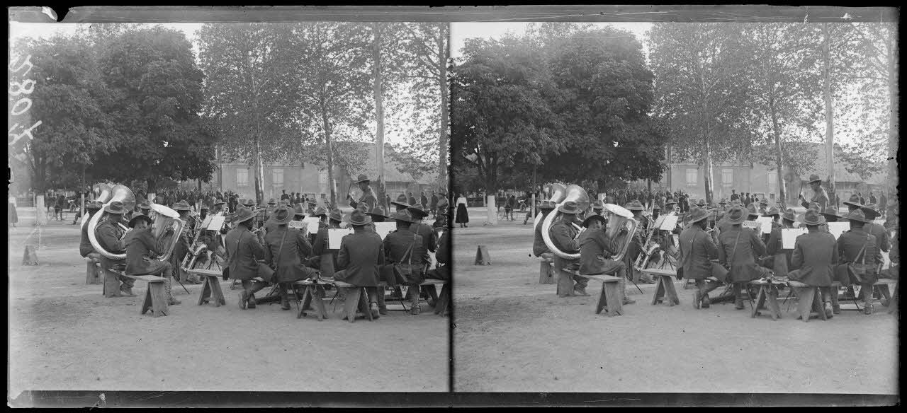 Grandvillars, Territoire de Belfort, cantonnement du 370e d'infanterie américaine. La musique sur la place. [légende d'origine]