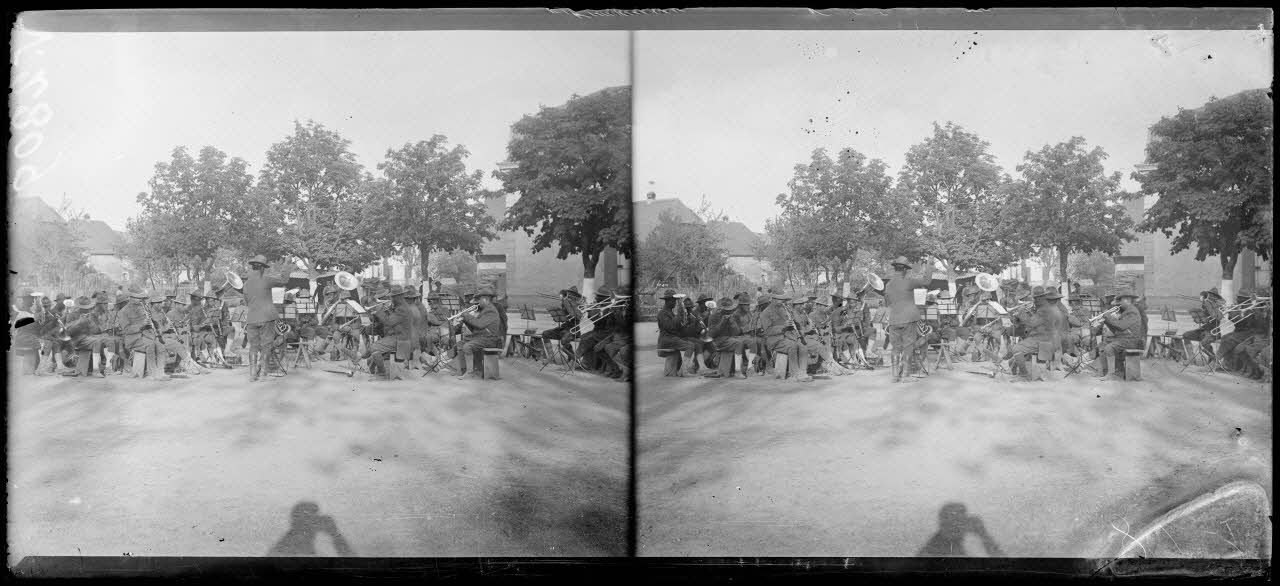 Grandvillars, Territoire de Belfort, cantonnement du 370e d'infanterie américaine. La musique sur la place.