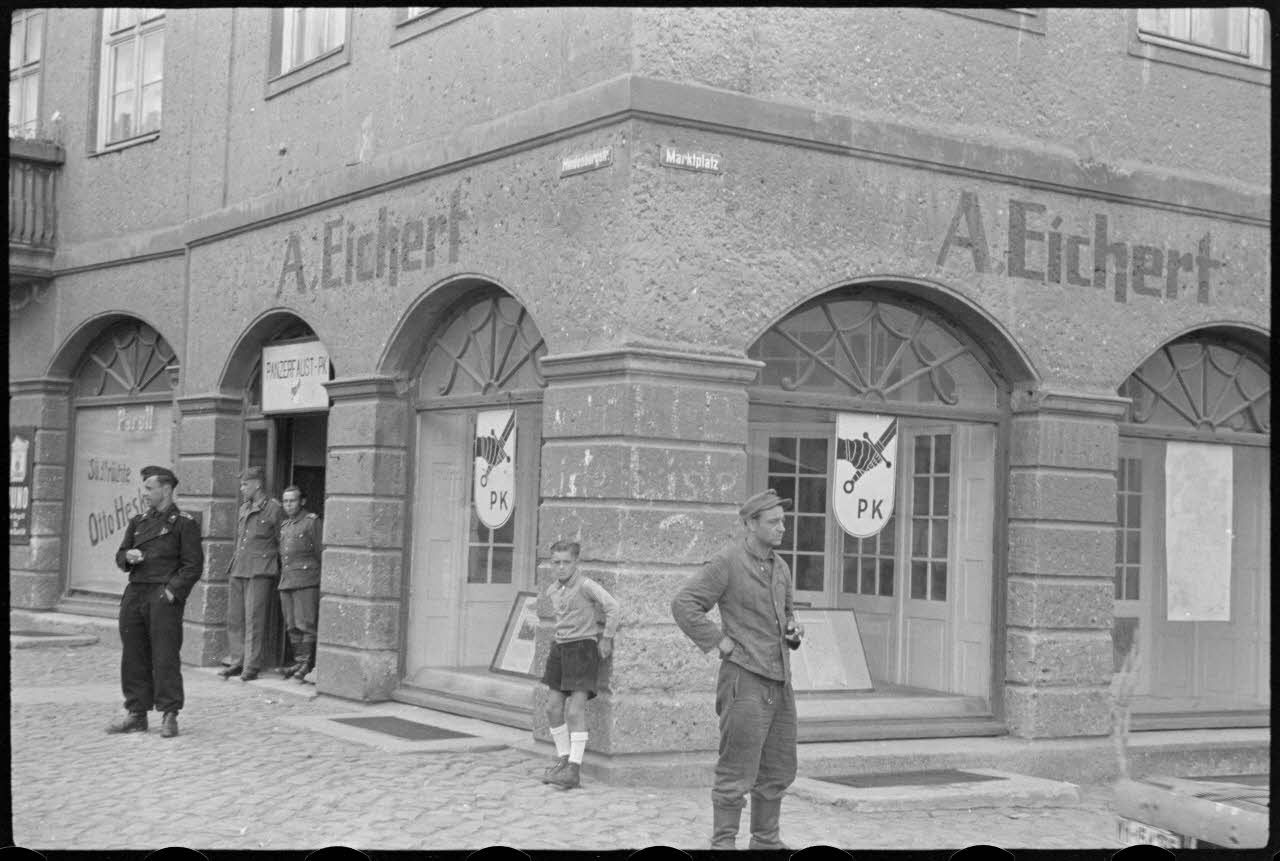 Les bureaux de la Pk.697 et du journal Panzerfaust situés entre la rue Hinderburgstrasse et la place Markplatz à Eydtkau en Prusse-Orientale.