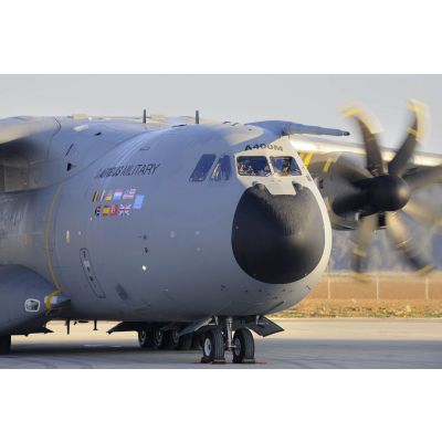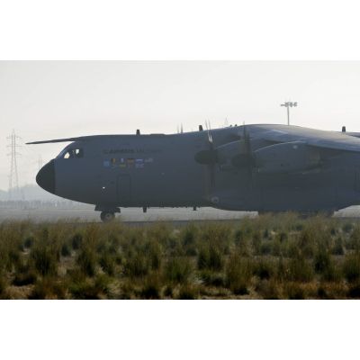 L'A400M au roulage sur le tarmac de l'aéroport de Séville lors de son premier vol.