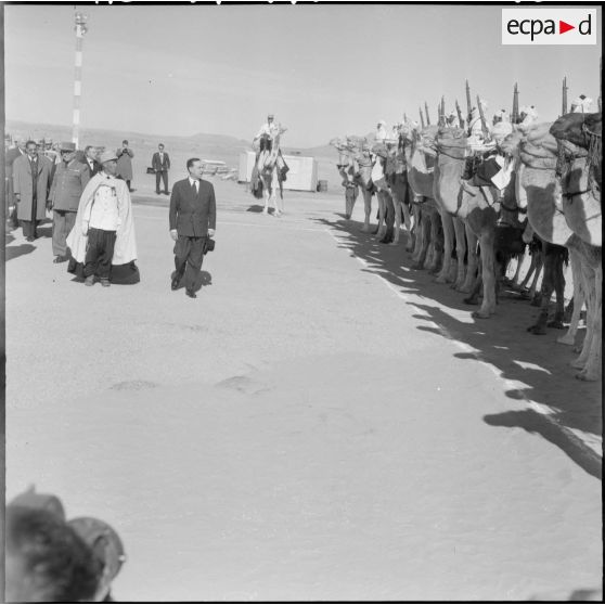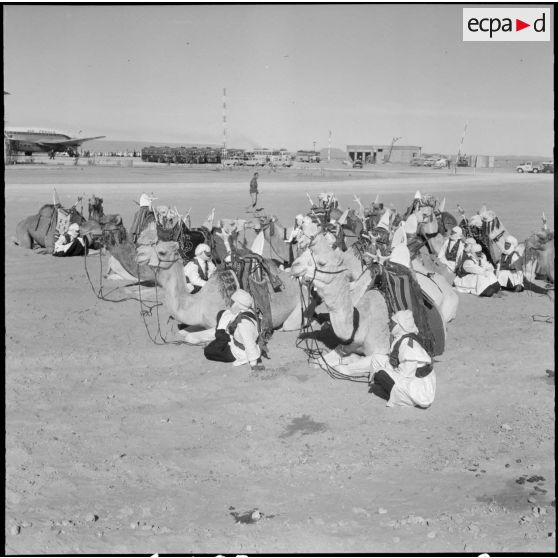 Inauguration de l'oléoduc Hassi Messaoud-Bougie. Une compagnie méhariste saharienne attend l'arrivée des autorités à l'aéroport.