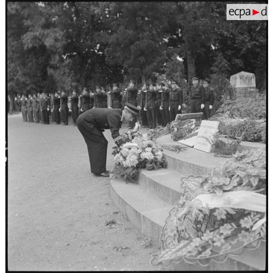 Dépôt de gerbe au pied d'un monument aux morts par le capitaine Jean-Louis Garot.