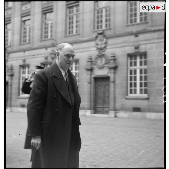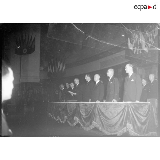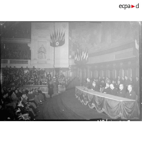 Le ministre de l'Air Charles Tillon prend la parole lors du congrès de l'Air à la Sorbonne.