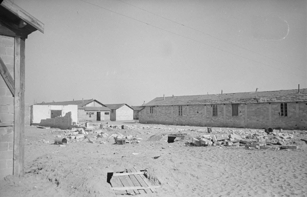 En Gironde, un Frontstalag dans le secteur de Bordeaux (peut-être le Frontstalag 221) et des rues de Bordeaux endommagées.