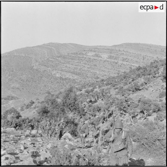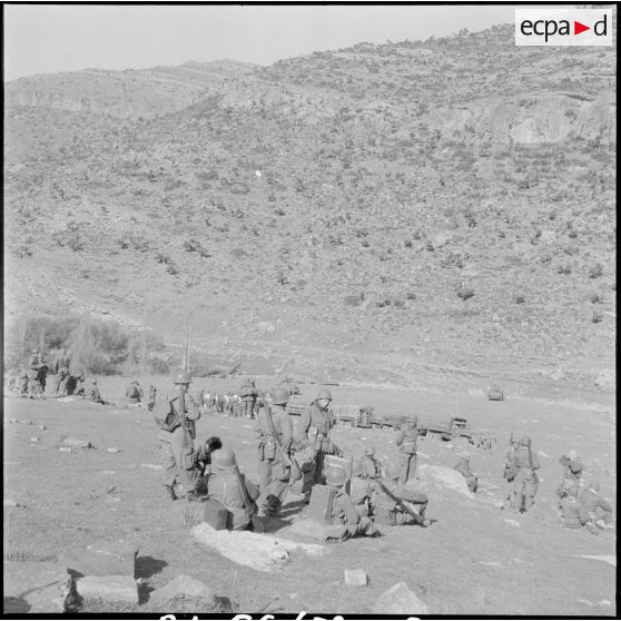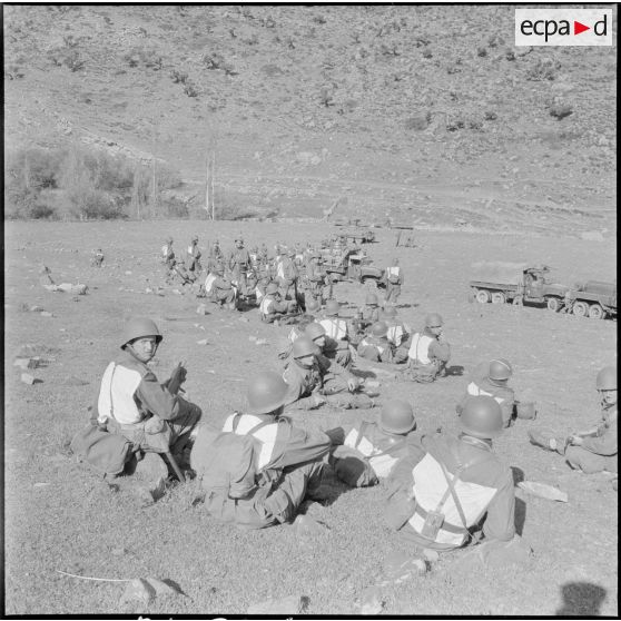 Officier supérieur semblant donner des consignes près de l’endroit où les militaires participant à l’opération sont rassemblés (R1). Rassemblement de soldats assis sur le sol (R2, R3). Les chasubles portées par certains d’entre eux semblent montrer que l’opération est un exercice. Colonne de soldat progressant dans le djebel (R4, R6, R7). Croisement de deux camions dodge 4x4 transportant des militaires (R5). Camions dodge 4x4 rassemblés sur une place de village (R8). Au premier plan, groupe d’hommes algériens réunis sur le sol. Au second plan, une mosquée.