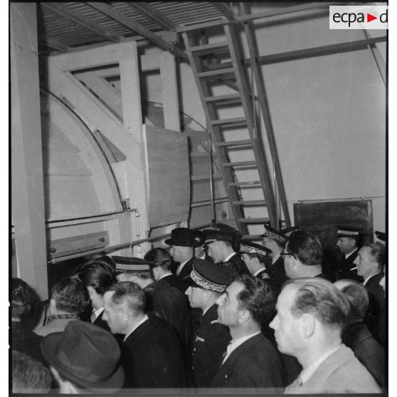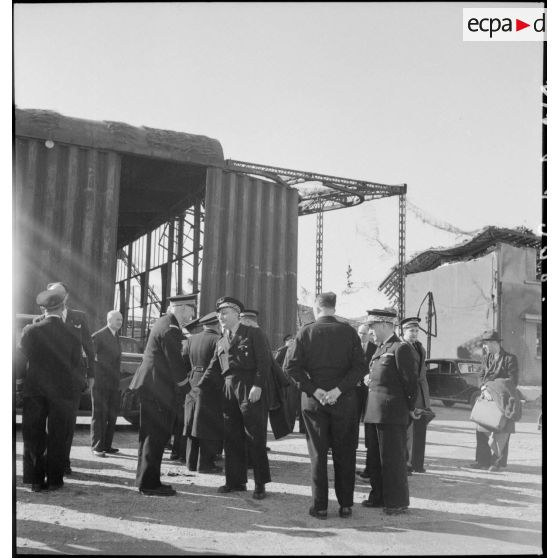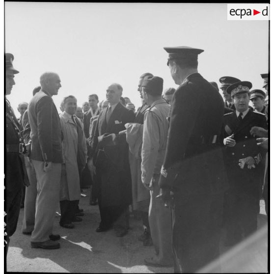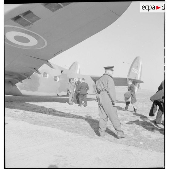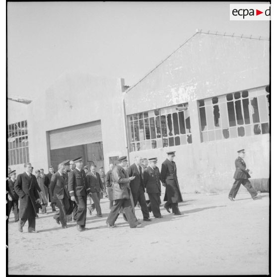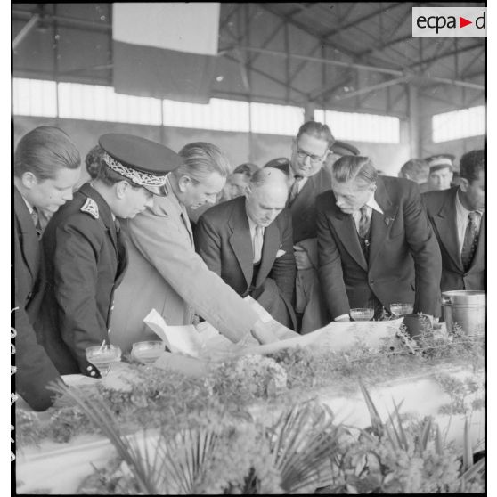 La délégation du ministre de l'Air Charles Tillon, en visite aux usines de la SNCASE à Marignane, examine le prototype d'un nouvel avion, semble-t-il un SE-2310 (avion d'instruction de l'armée de l'Air, version militaire de l'avion de tourisme SE-2300).