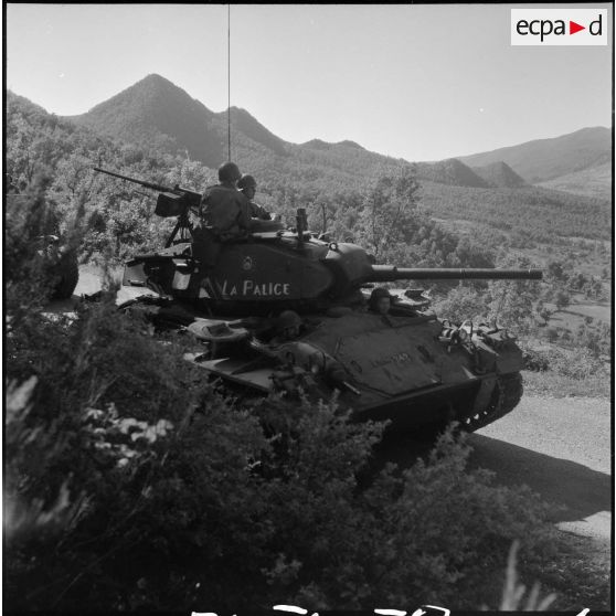 Un char M24 Chaffee nommé La Palice sur une route de montagne, l’équipage est visible (R1). Le char M24 Chaffee nommé La Palice est doublé sur la route par un Light armored car M8 (R2). Portrait d’un conducteur de char (R3). Portrait de groupe d’un équipage de char effectué directement sur le blindé roulant (R4). Photographie de groupe d’équipage de chars (R5). Vue sur le convoi motorisé en progression (R6). Chars M24 Chaffee dont un nommé Royan à l’arrêt sur une route (R7). Chars M24 Chaffee à l’arrêt, des membres des équipages observent les environs à la jumelle (R8).