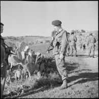 Progression d'une colonne d'appelés du bataillon de Joinville dans le djebel.
