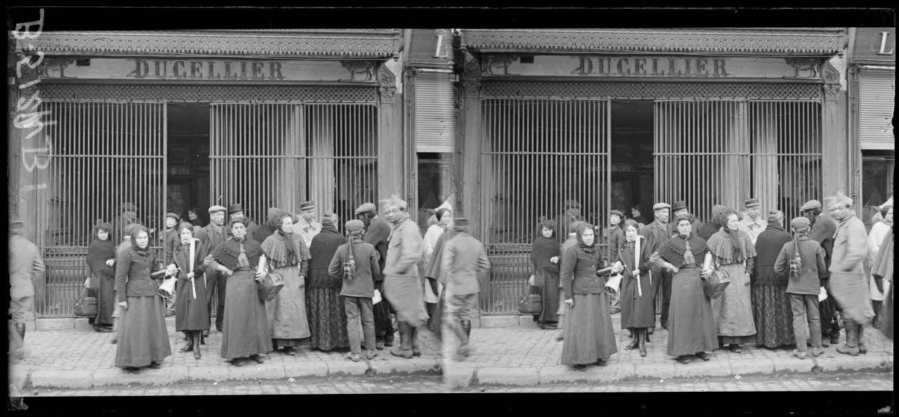 Noyon, la population se ravitaille devant la boucherie. [légende d’origine]
