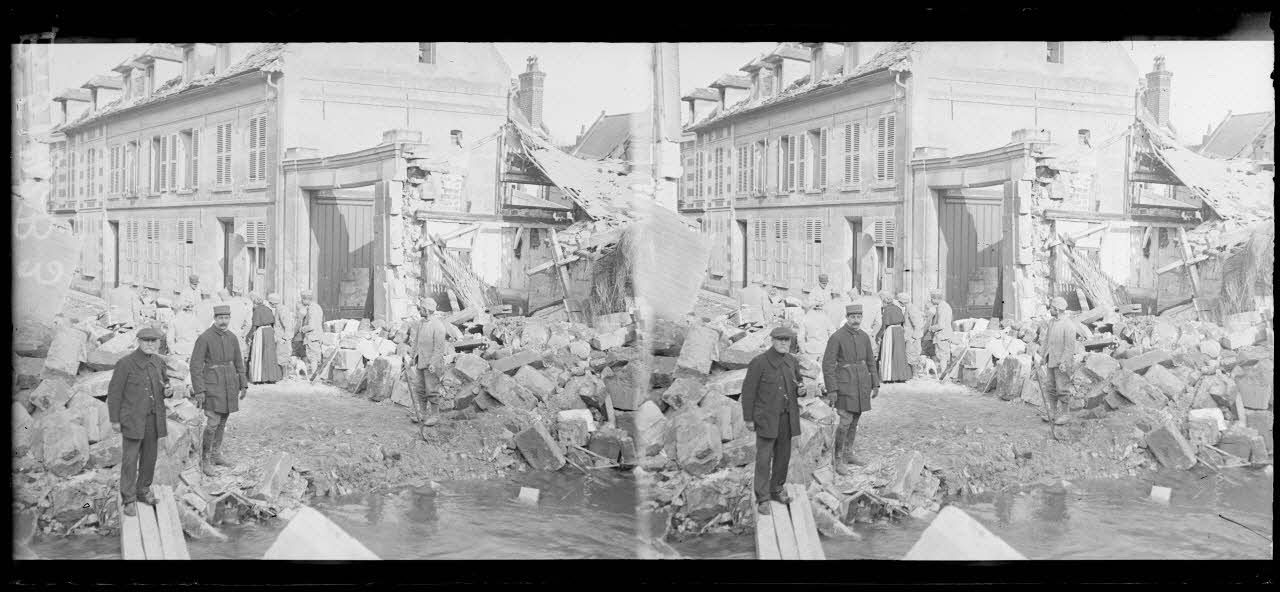 Noyon, la rue de la Boucherie, au 1er plan un trou de mine fait par les allemands au bord de la Verre. [légende d’origine]