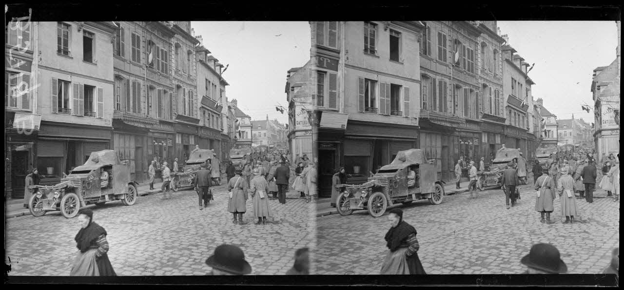 Noyon. Auto-mitrailleuses traversant la place de l'hôtel de ville.
