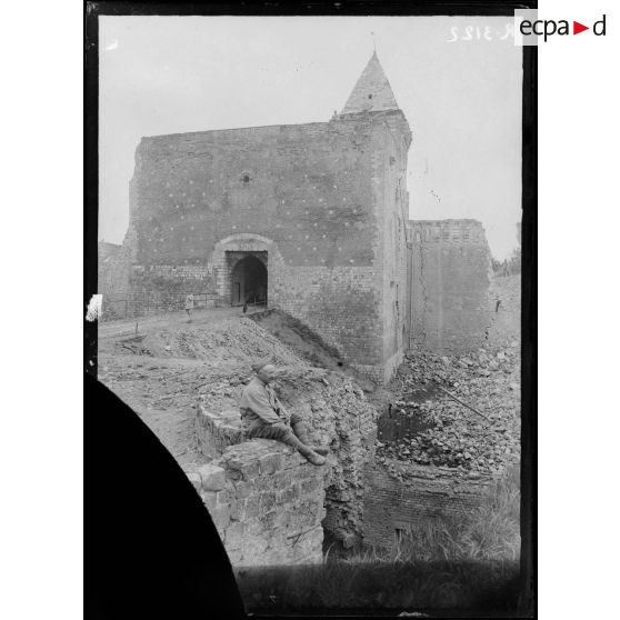 Ham, Somme, l'entrée du château. Vue extérieure et fossé de gauche.