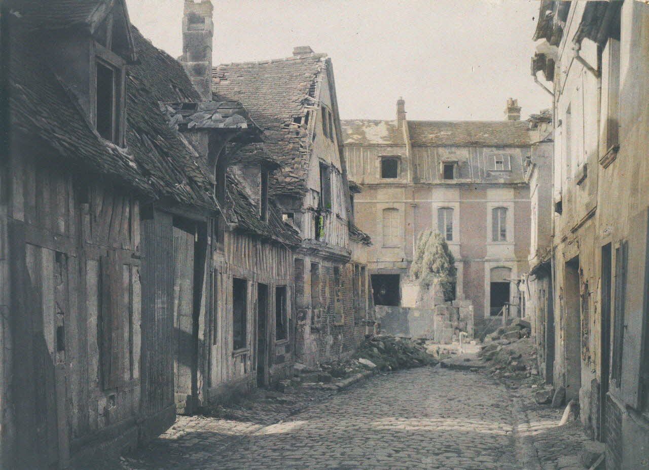- les ruines et destructions occasionnées par la guerre à Verdun, Reims, Arras ou ailleurs : maisons, églises, cathédrales, lieux symboliques des grandes villes de province en ruines ;