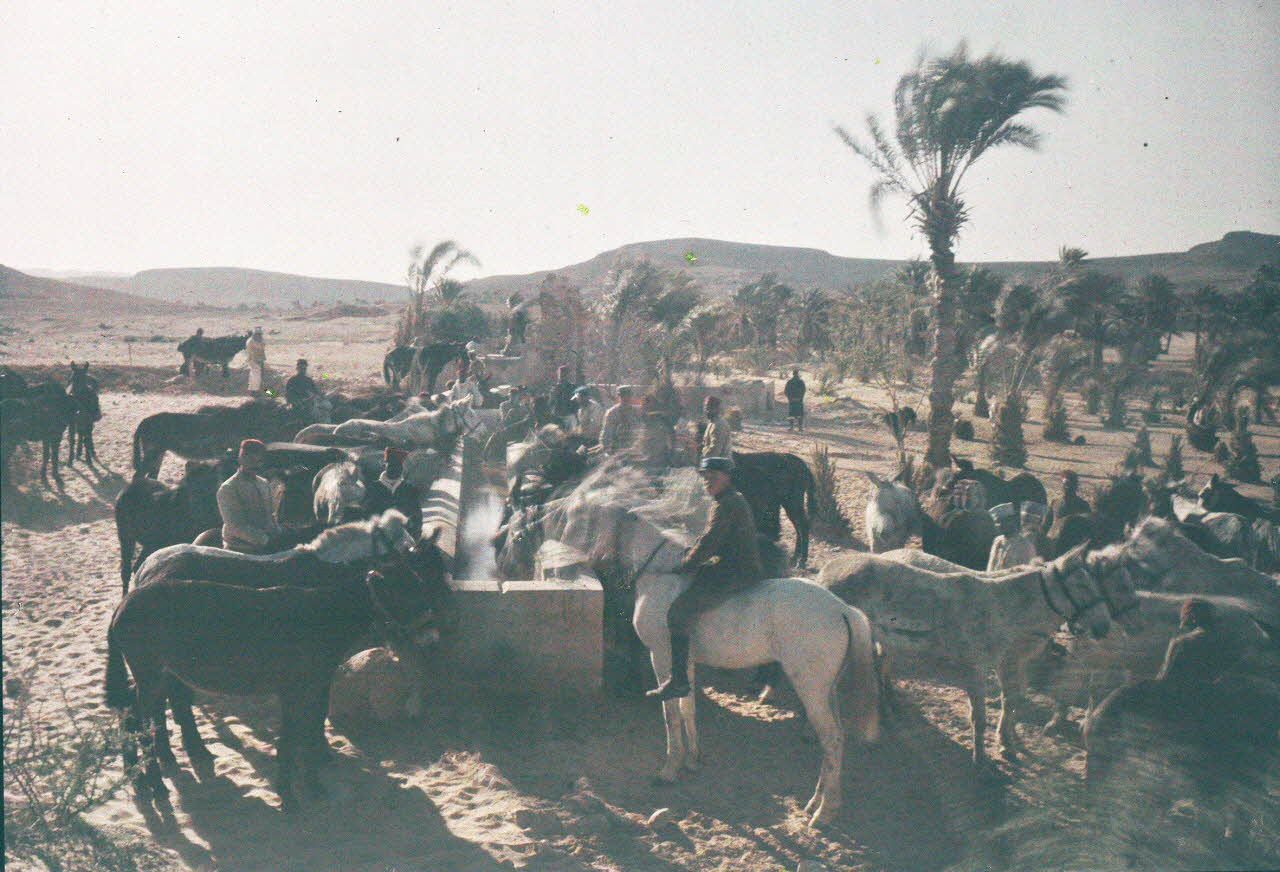 Oasis de Foum Tataouin. Chevaux et mulets à l'abreuvoir. [légende d'origine]