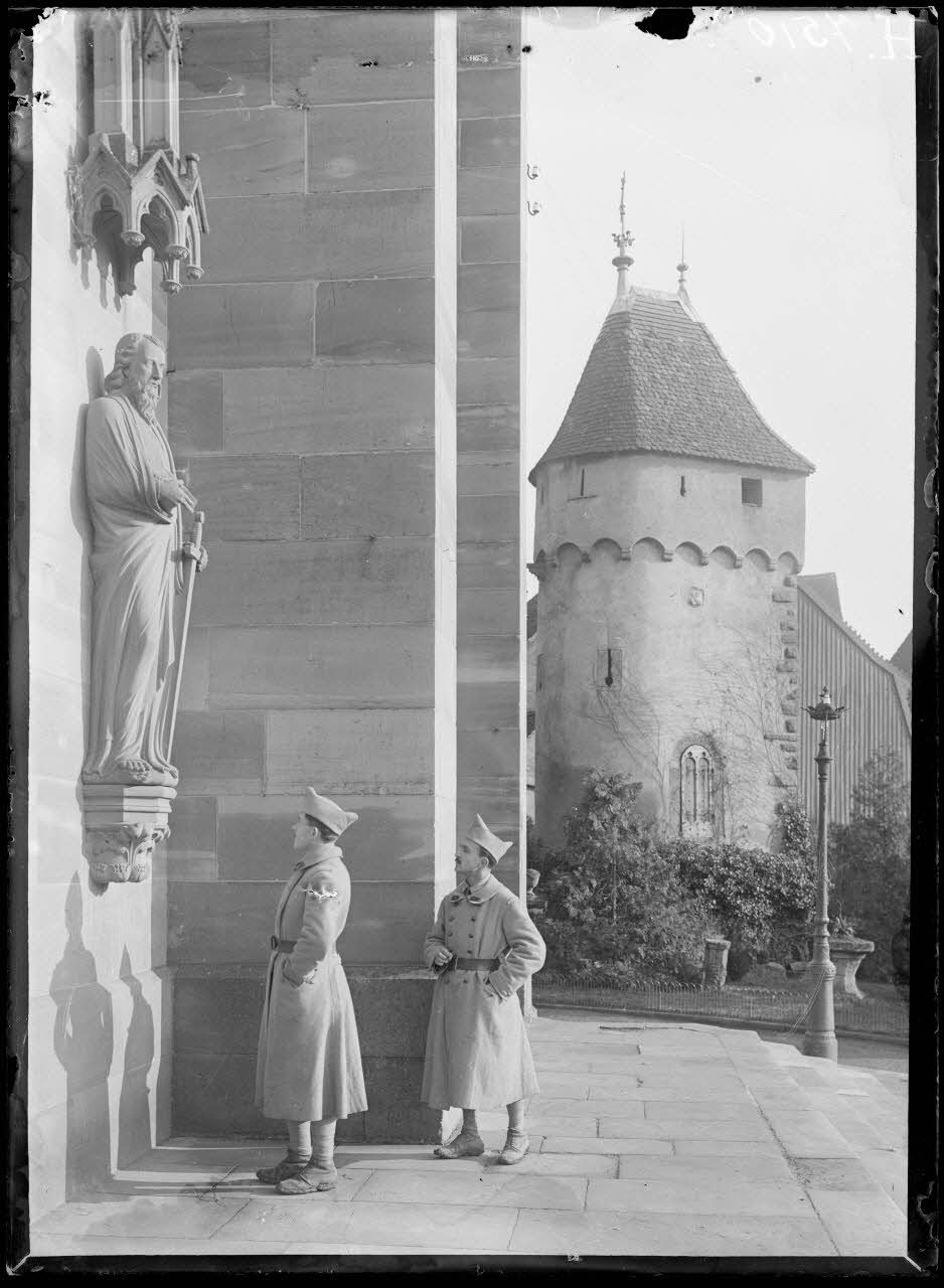 A Strasbourg, au début du mois de décembre 1918, des soldats alsaciens libérés du service militaire allemand passent sur le pont Kehl, gardé à chaque extrémité par des sentinelles (d'un côté sentinelles allemandes, de l'autre sentinelles françaises). Les évacués en provenance d'Allemagne sont triés. Sur ce pont, des officiers français réceptionnent des camions allemands (camions Dameler avec roues ferrées à amortisseurs remplaçant les pneumatiques).
