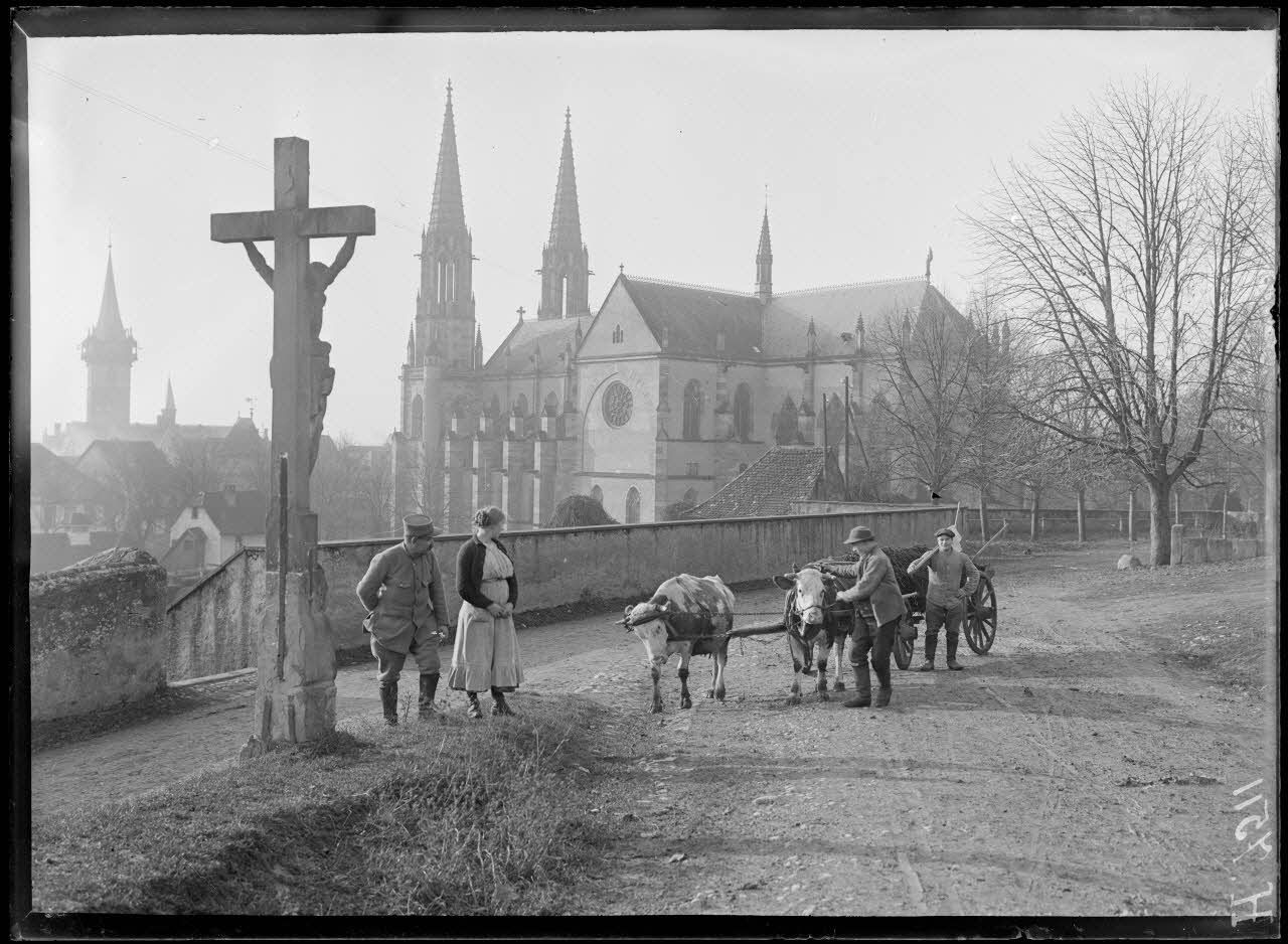 A Strasbourg, au début du mois de décembre 1918, des soldats alsaciens libérés du service militaire allemand passent sur le pont Kehl, gardé à chaque extrémité par des sentinelles (d'un côté sentinelles allemandes, de l'autre sentinelles françaises). Les évacués en provenance d'Allemagne sont triés. Sur ce pont, des officiers français réceptionnent des camions allemands (camions Dameler avec roues ferrées à amortisseurs remplaçant les pneumatiques).