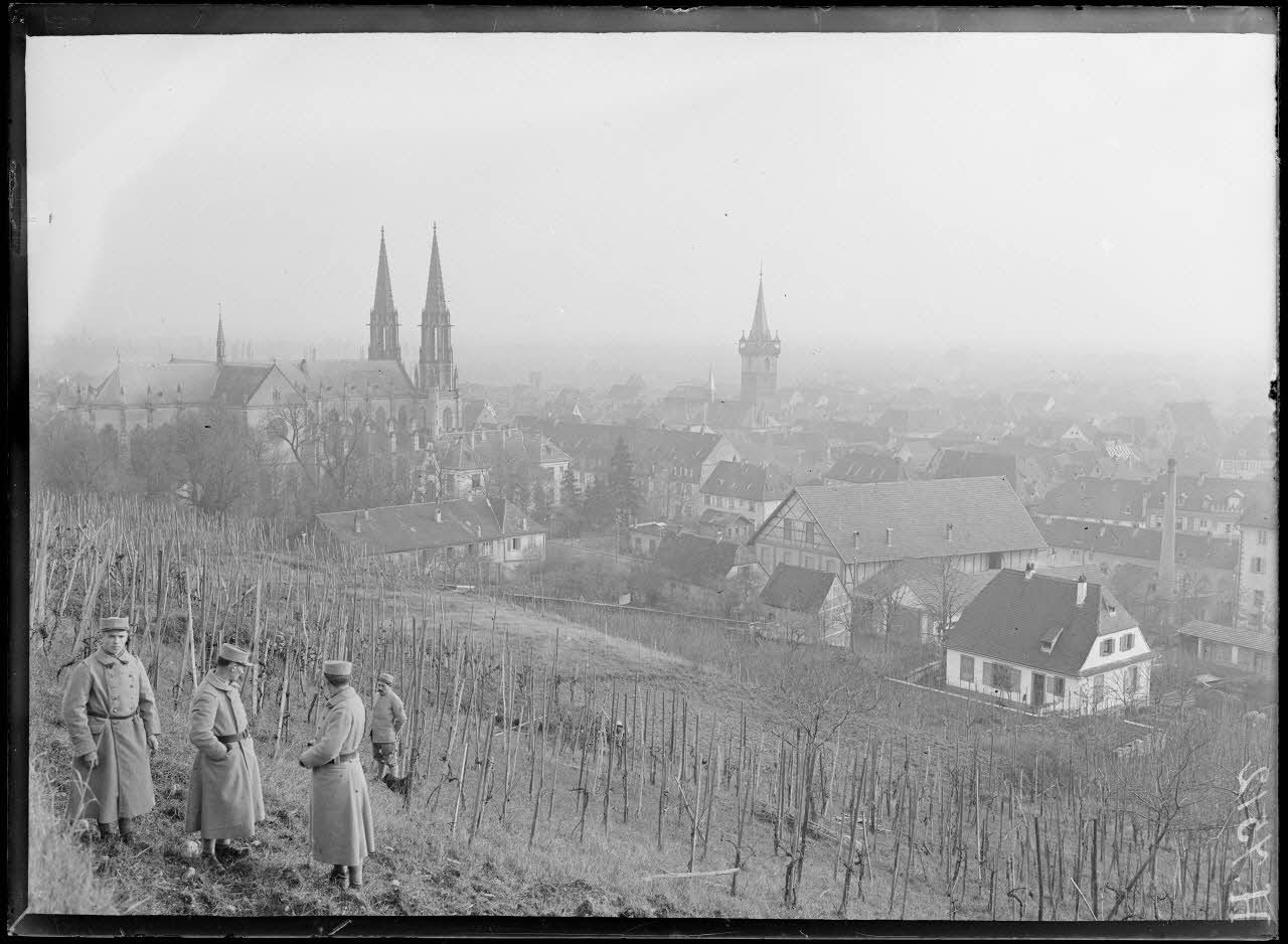 A Strasbourg, au début du mois de décembre 1918, des soldats alsaciens libérés du service militaire allemand passent sur le pont Kehl, gardé à chaque extrémité par des sentinelles (d'un côté sentinelles allemandes, de l'autre sentinelles françaises). Les évacués en provenance d'Allemagne sont triés. Sur ce pont, des officiers français réceptionnent des camions allemands (camions Dameler avec roues ferrées à amortisseurs remplaçant les pneumatiques).