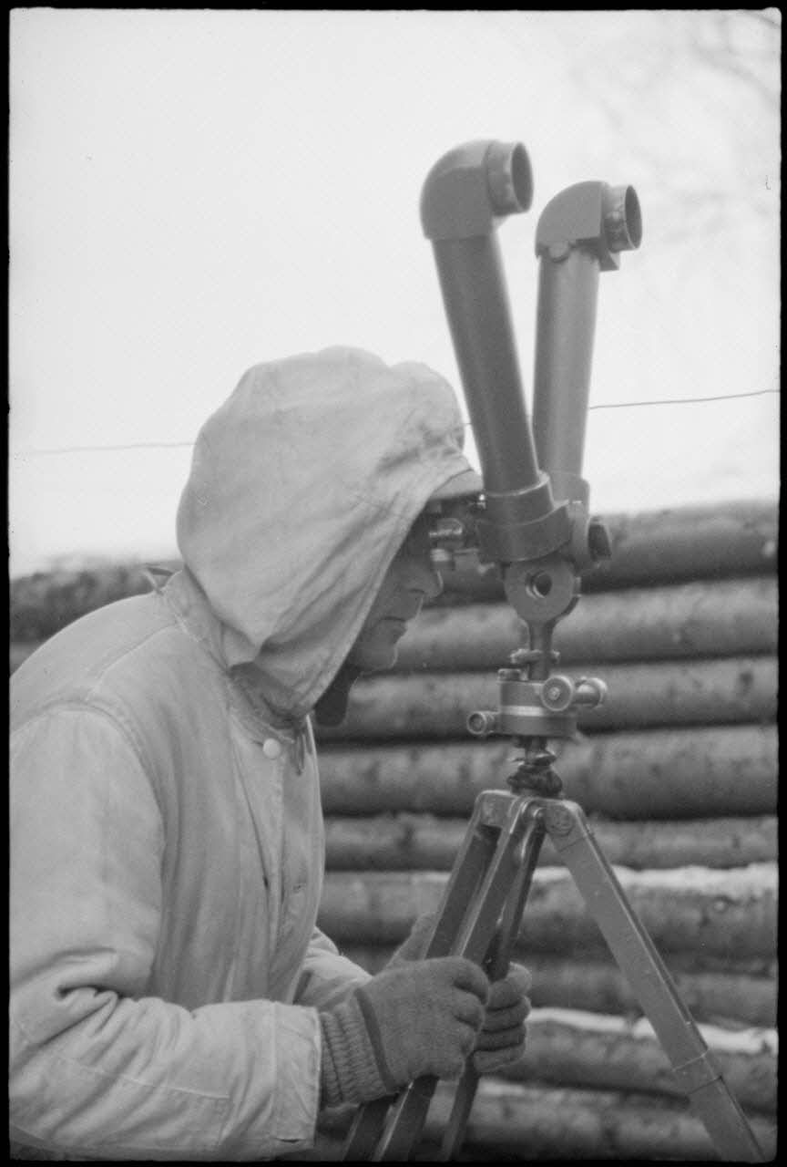 Observation aux jumelles depuis une isba qui abrite les fantassins allemands en charge du contrôle des voies ferrées.