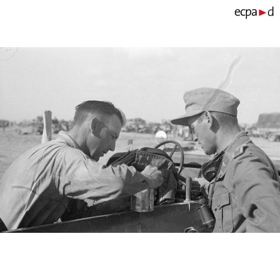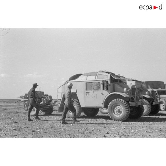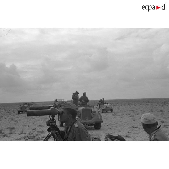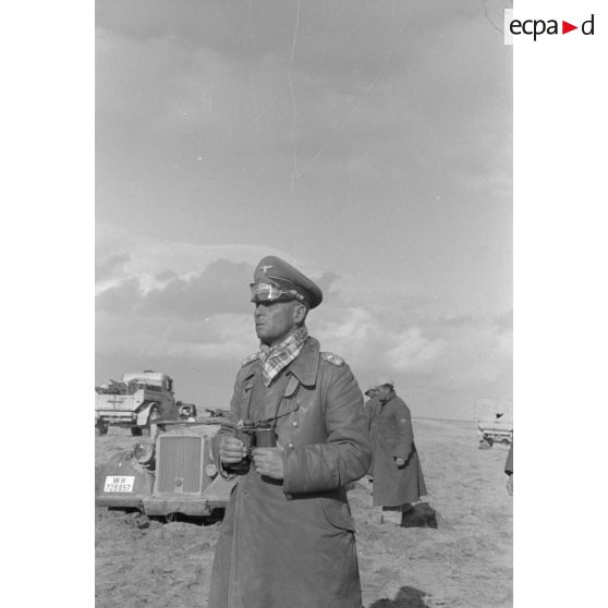 Observation aux jumelles, le général Rommel est au second plan à bord de sa Kfz.21.