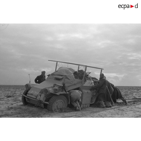 Un véhicule de reconnaissance Sd.kfz.223 embourbé, on note l'immatriculation WH 638 532.