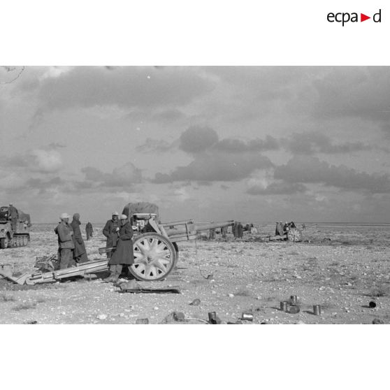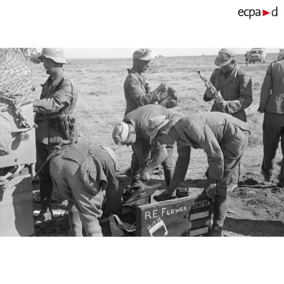 Des artilleurs allemands fouillent des tracteurs d'artillerie britanniques, on remarque un canon de 25 Ordnance QF Mk2.