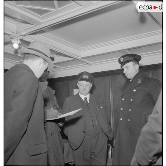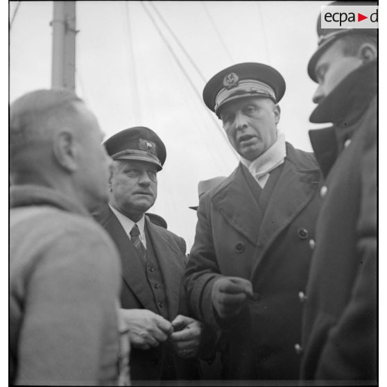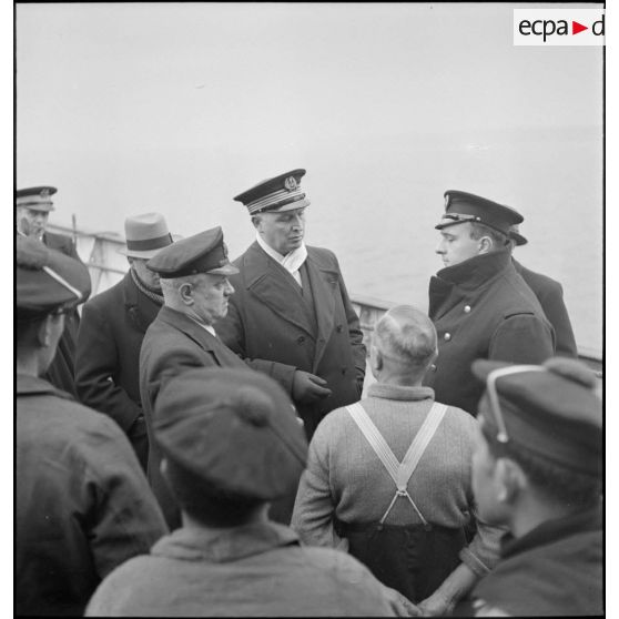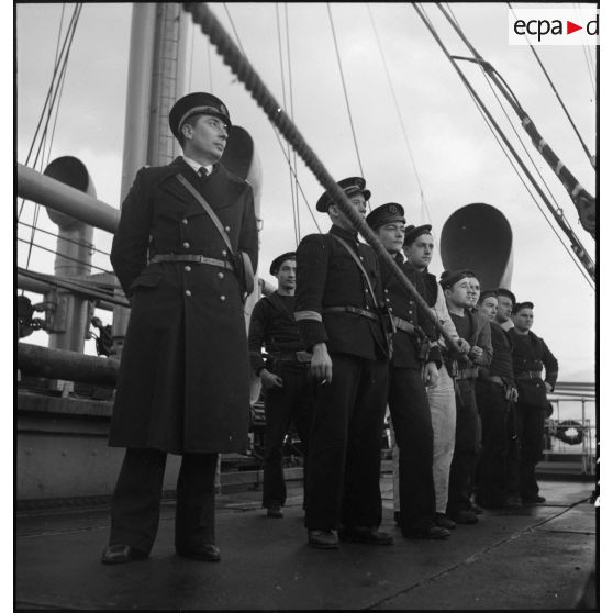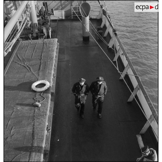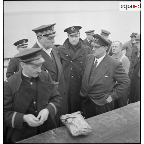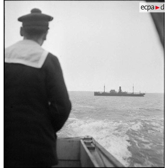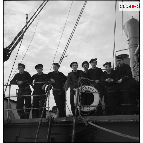 Marins français circulant sur le pont du navire marchand allemand le Rostock.