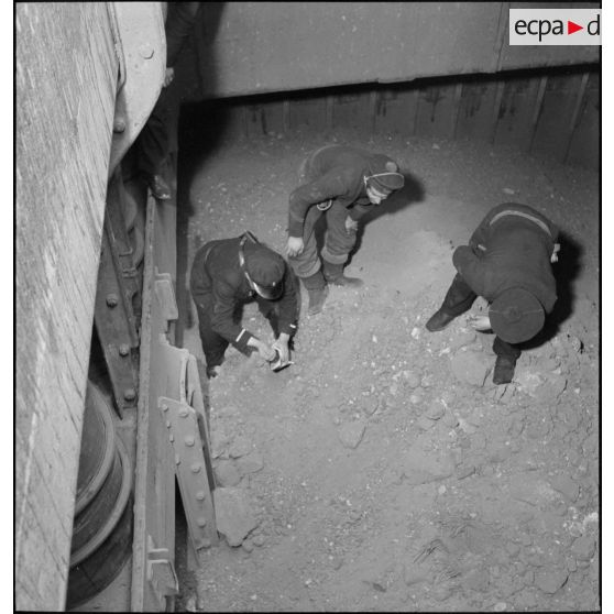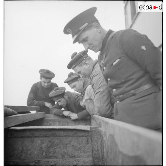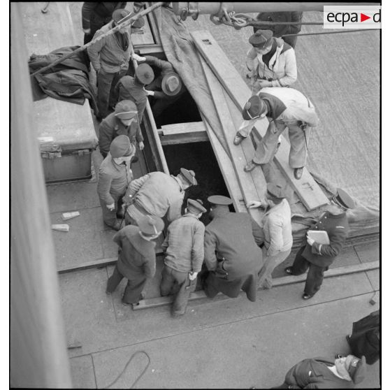 Marins français inspectant les cales du navire marchand allemand le Rostock.