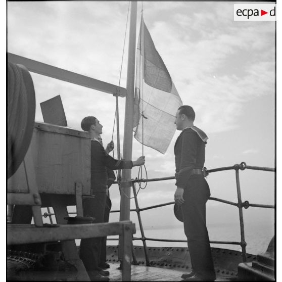Pavillon français hissé sur le navire marchand allemand Rostock.