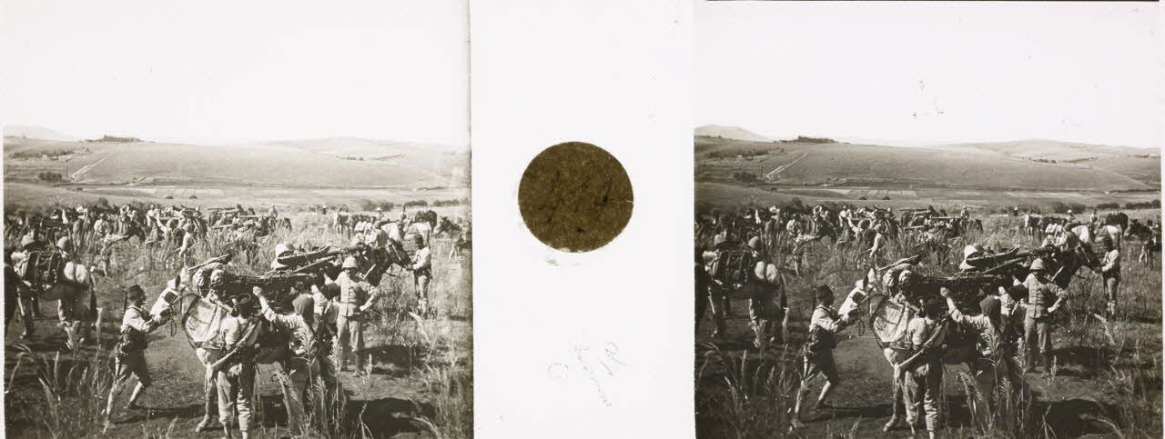 On décharge les mulets. Mise en batterie. [légende d'origine]