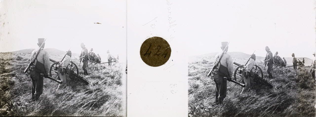 D68-42. Autour de Tananarive, les tirailleurs du 1er régiment de tirailleurs malgaches et les artilleurs de la 3e batterie du 7e régiment d'artillerie exécutent diverses manoeuvres. Ces évolutions sont destinées à apprécier la mobilité des batteries sur le terrain et à s'entraîner au tir. Le relief tourmenté, les cours d'eau et l'absence de routes praticables accentuent la difficulté des déploiements. Les rivières sont traversées à gué ou franchies sur d'étroites pirogues mises bout à bout. Deux types de canons de Bange de calibre de 80 mm sont alors utilisés : les canons de campagne, tirés par des attelages, et les canons de montagne, transportés en pièces détachées par des mulets. Les hommes sont équipés de mousquetons d'artillerie modèle 1892. Arrivés sur le champ de tir, les mulets sont déchargés et les pièces mises en batterie pour effectuer les exercices de tir.