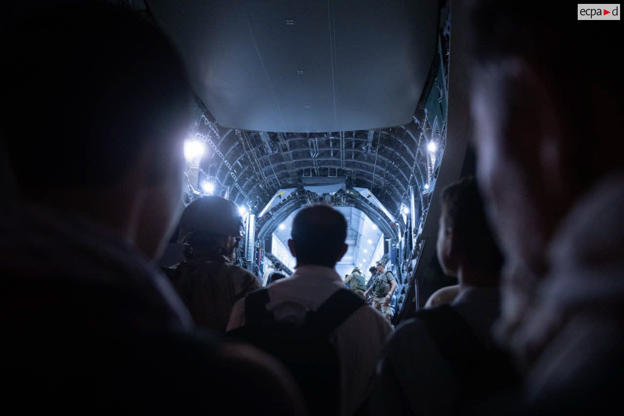 - Evacuation de ressortissants à bord d'un avion-cargo Transall C-160 depuis l'aéroport de Kaboul, en Afghanistan.