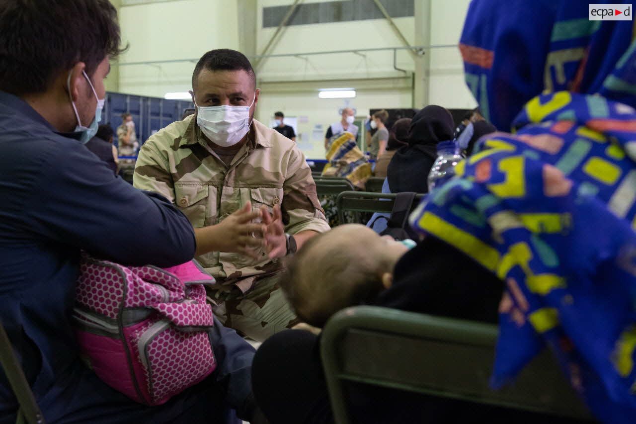 - Un soldat discute avec des réfugiés afghans à Al Dhafra, aux Emirats arabes unis.