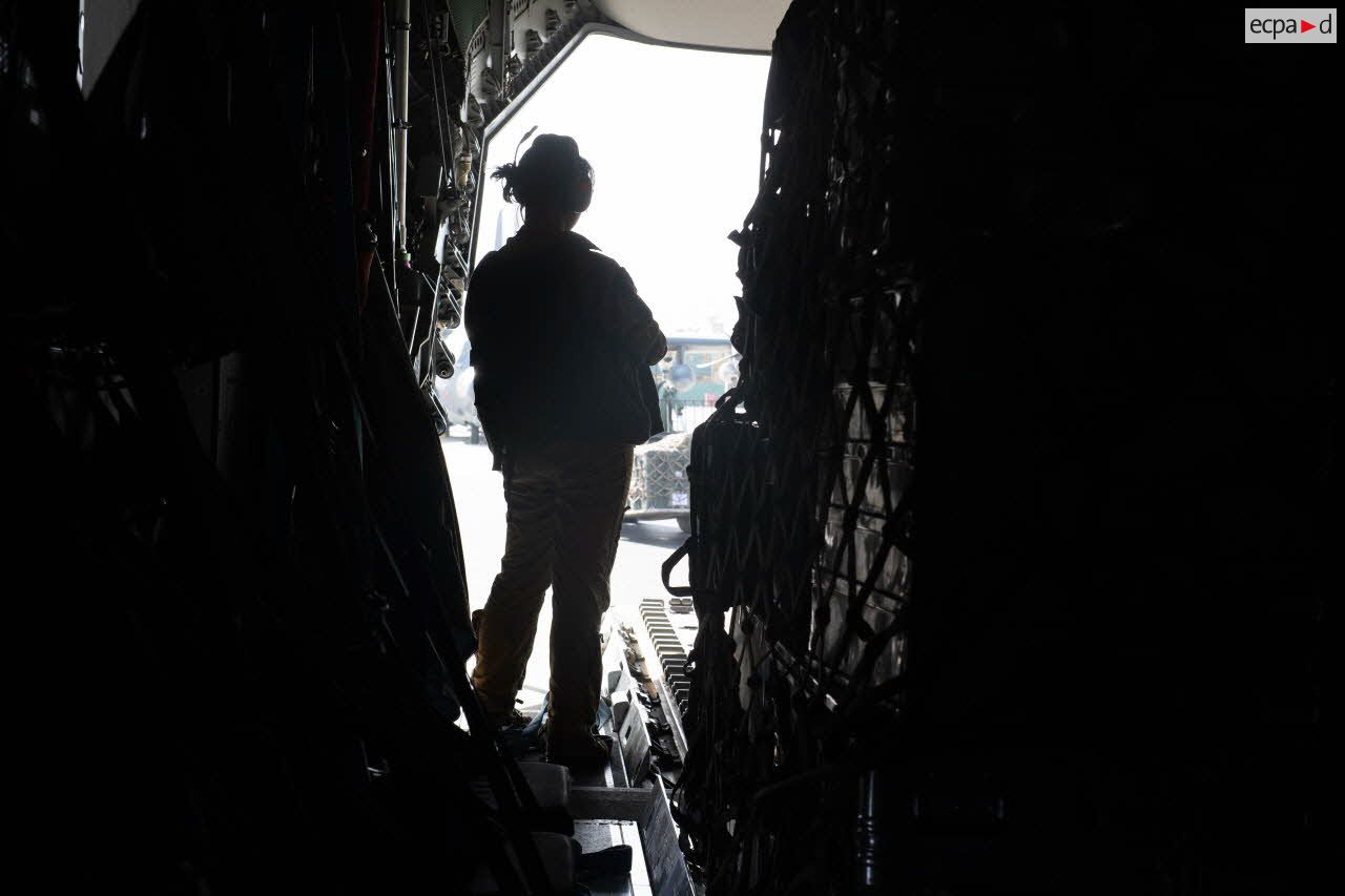 - Un soldat encadre l'évacuation de ressortissants à bord d'un avion-cargo Lockheed Hercules C-130 à Kaboul, en Afghanistan.