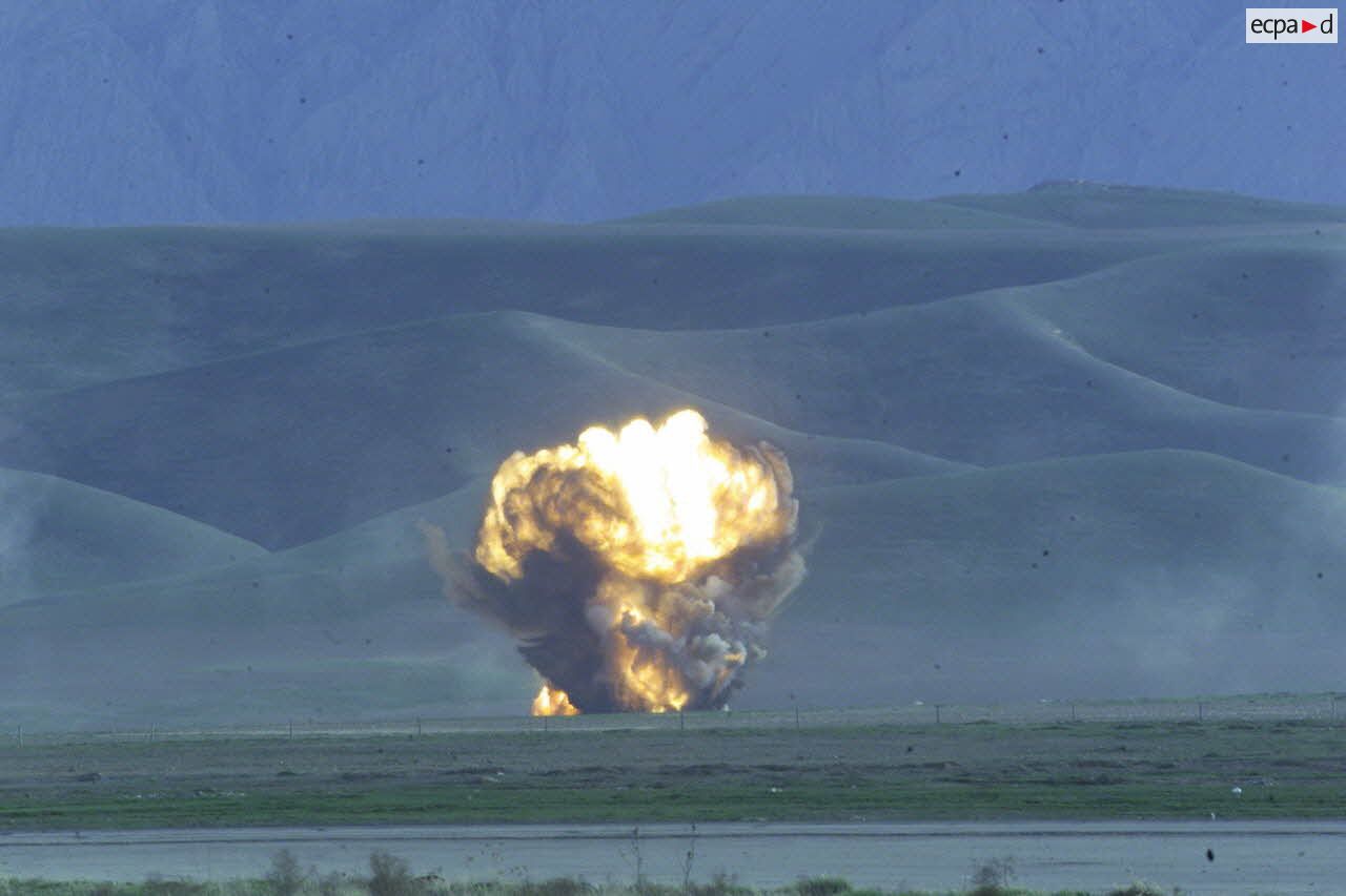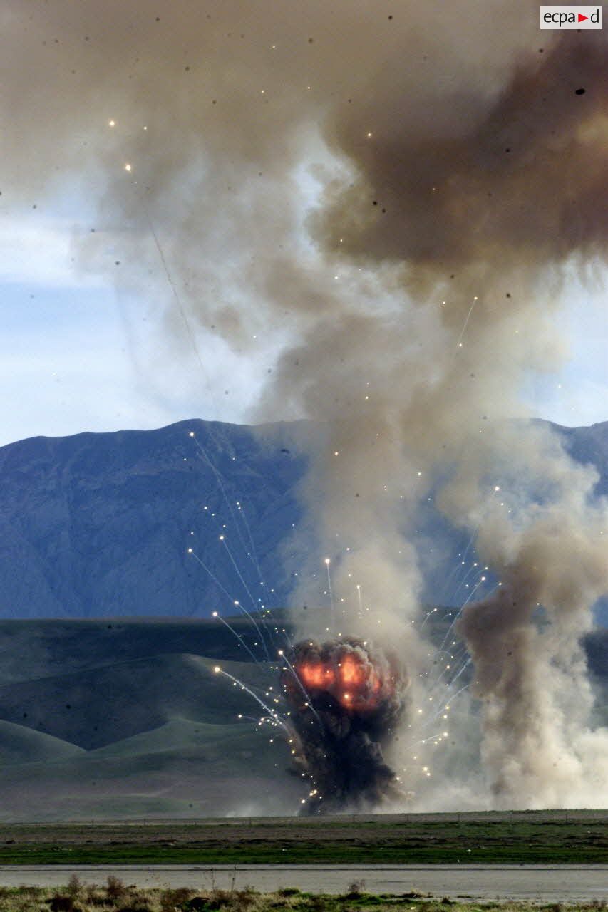 Dépollution de la zone de l'aéroport de Mazar e Charif de munitions soviétiques par l'EOD (élément opérationnel de déminage et de dépollution) du 1er REG (régiment étranger du génie) avec l'aide de démineurs américains. Feu et fumée lors de l'explosion des fourneaux. -