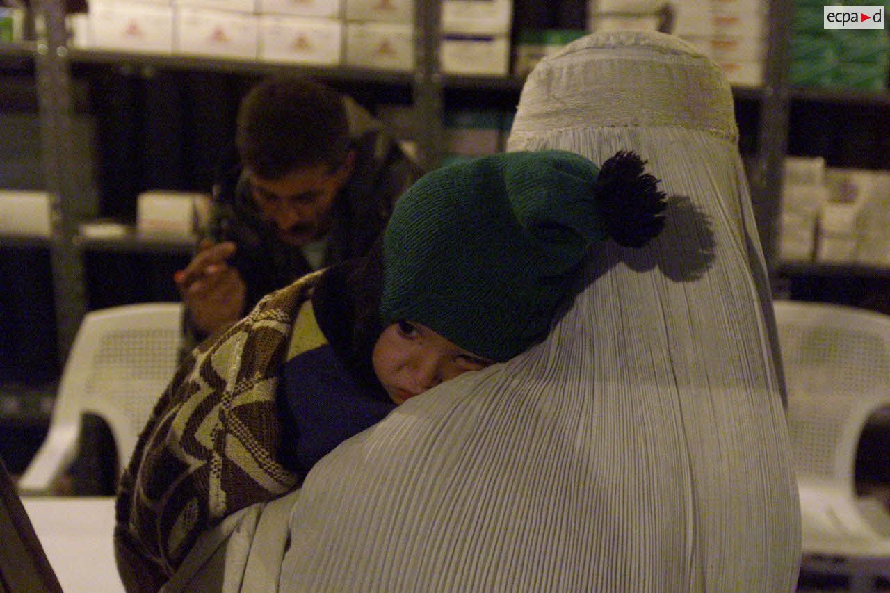 - Consultations pour la population civile à l'hôpital jordanien de l'aéroport de Mazar e Charif. Femme afghane voilée venue consulter et portant un enfant, au comptoir de la pharmacie.