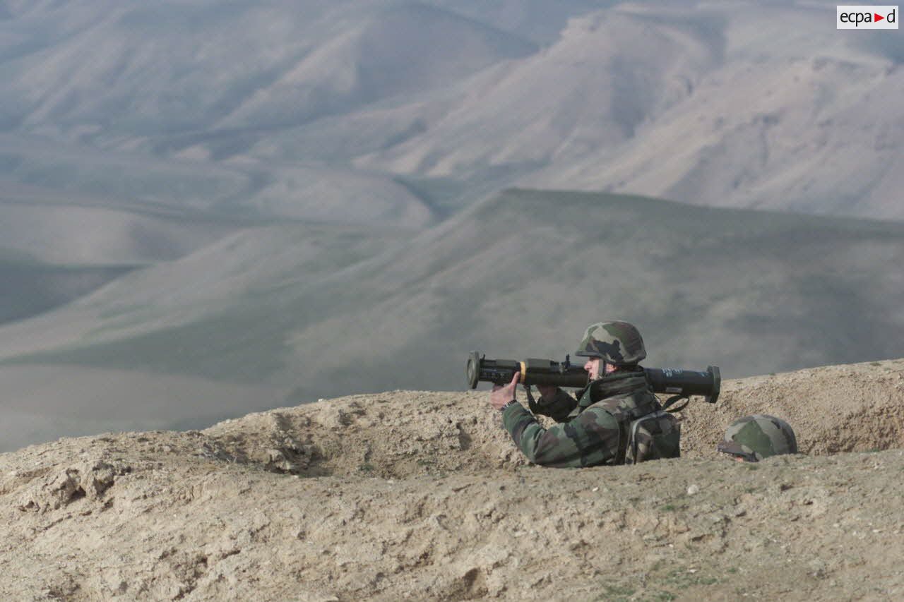 - Entraînement au tir d'une section de la 3e compagnie du 21e RIMa (régiment d'infanterie de marine) à Mazar e Charif. Prise de visée et position de tir au LRAC (lance-roquette antichar) AT 4 CS pendant la séance.